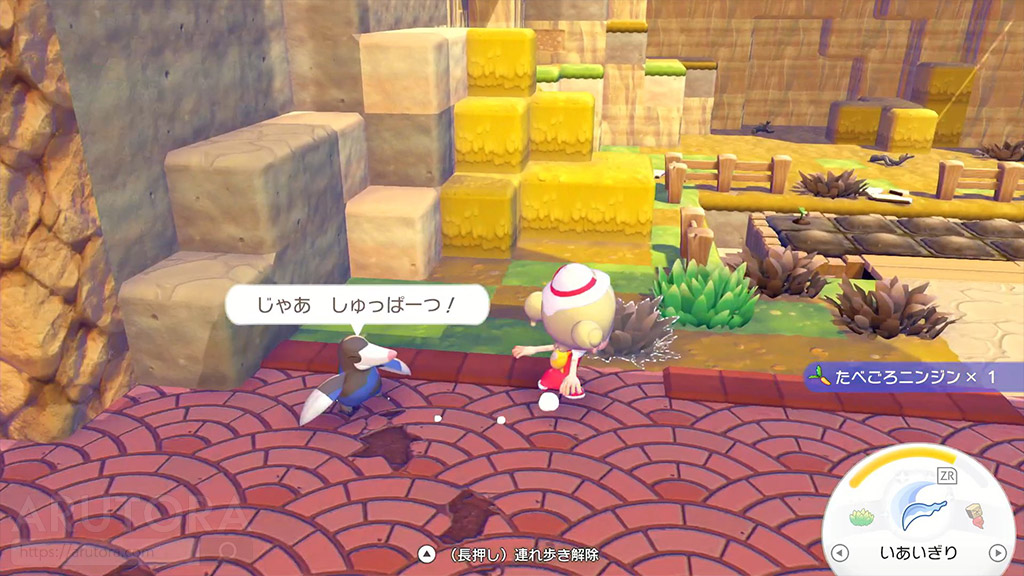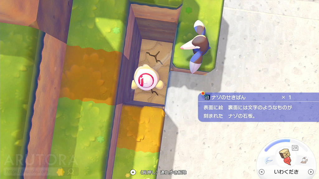 このときダウジングをしてくれるポケモンは、宝物が埋まっているブロックの手前で台詞を発するので、掘るべきはポケモンが見ているブロックの垂直方向になります。