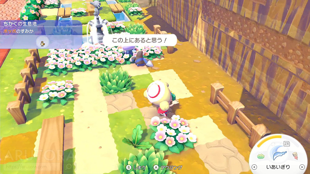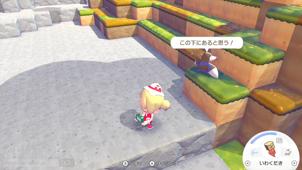 Aボタンでダウジングができるようになっていますので、押してみるとダウジングマシンの音がすると同時に、一緒に行動しているさがしものが得意なポケモンが反応して、お宝の在りかを教えてくれます。
