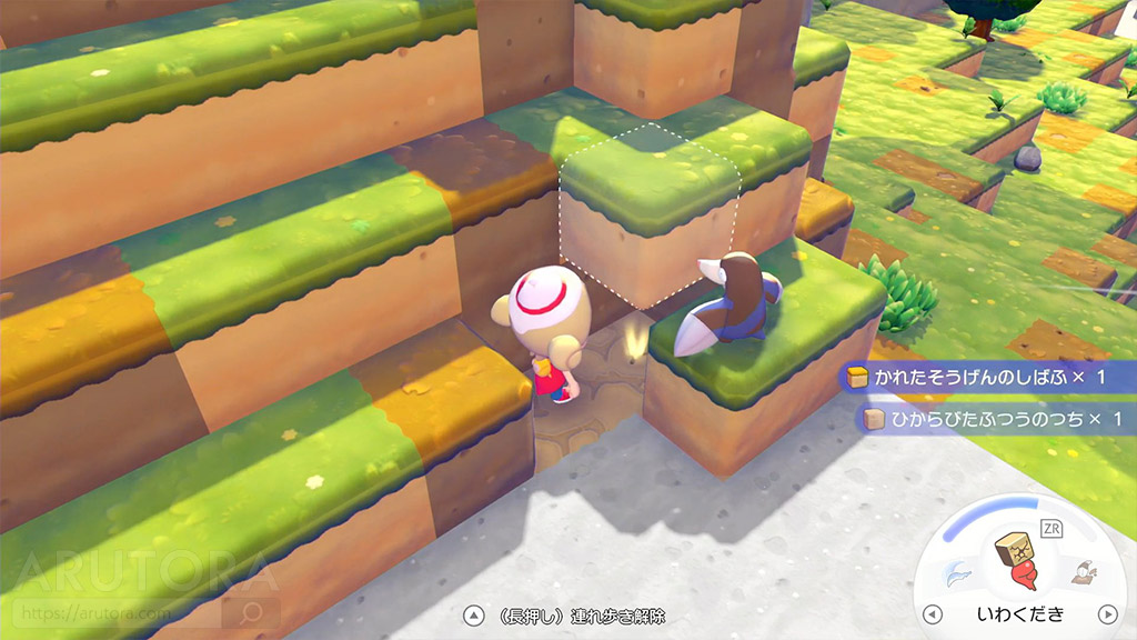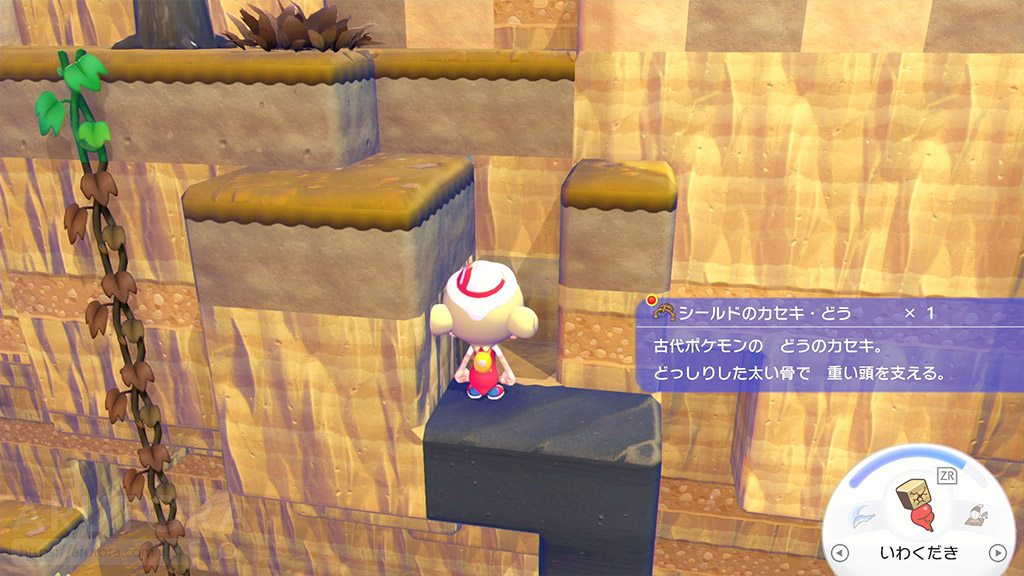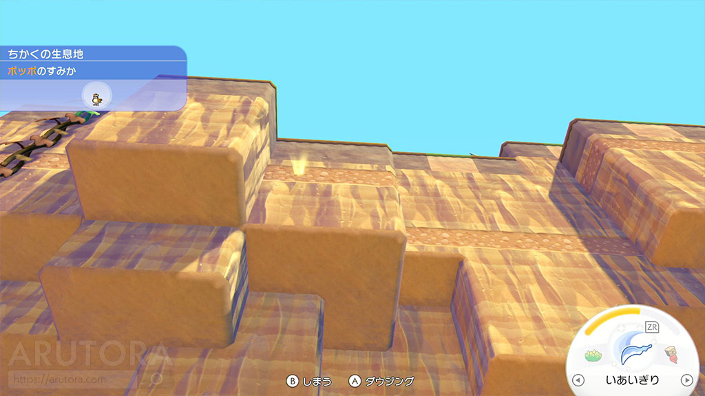 こうした頭上にあるタイプの宝は、足場を組んで垂直に登っていくのが効率的です。足場を組む方法はいくらでもありますが、個人的には「ゴツゴツやまの街」でいくらでも取れる「かざんばい」が扱いやすいのでオススメです。(見分けが付きやすくて壊しやすいので)