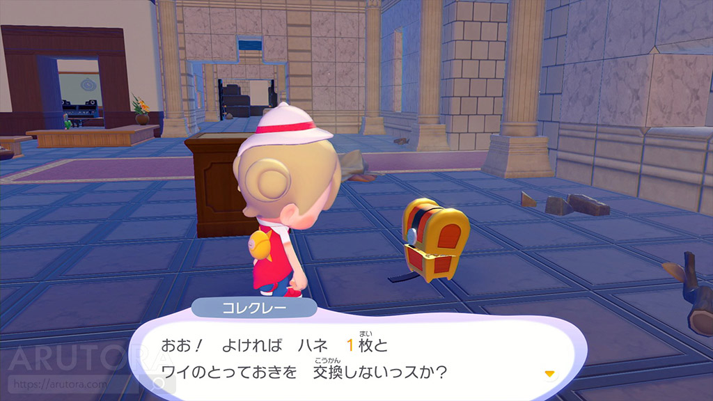 はくぶつかんにいるコレクレーに「いいものもってきたよ」と話しかけると、羽根1枚とランダムな家具1つを交換してくれます。